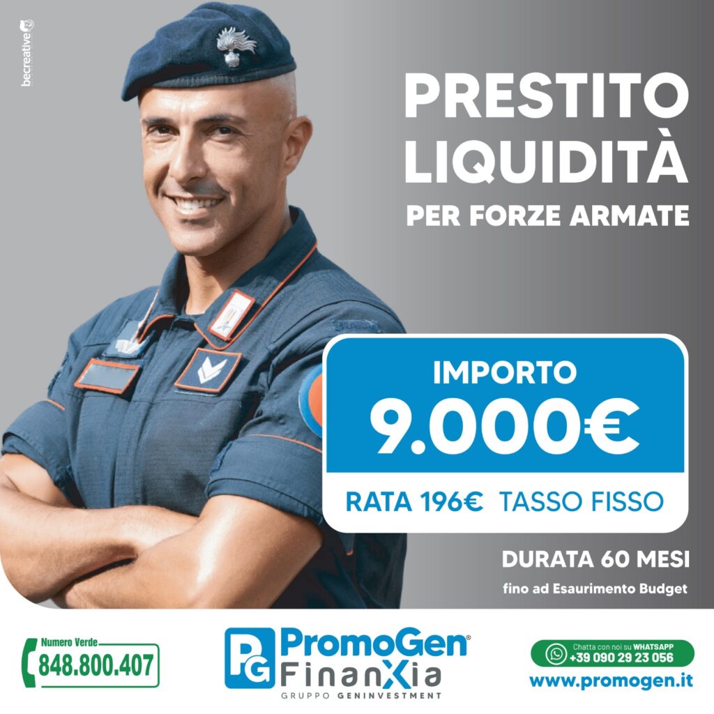 Promogen srl opera in qualità di agente della Prexta Spa, Intermediario Finanziario iscritto al n. 117 dell’Albo Unico tenuto da Banca d’Italia ai sensi dell’art. 106 del D. Lgs. 385/1993 (“TUB”) con sede legale in Via Ennio Doris, Palazzo Meucci – 20079 Milano 3 – Basiglio, (cod. fisc. 07551781003) e facente parte del Gruppo Bancario Mediolanum, per la distribuzione dei prodotti cessione del quinto, delegazione di pagamento, anticipo trattamento fine servizio e prestito personale di Prexta, la quale si riserva la valutazione del merito creditizio e dei requisiti necessari alla concessione dei finanziamenti, ovvero di altre Banche/Intermediari Finanziari collocati da Prexta. In tale ultima ipotesi questi ultimi, previa valutazione dei requisiti necessari alla concessione del finanziamento, saranno i diretti contraenti e titolari di tutti i rapporti contrattuali.